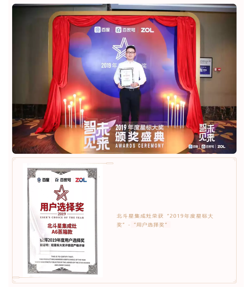 經過激烈角逐,北斗星集成灶憑借精工作品A6蒸箱款集成灶脫穎而出,榮獲“2019年度星標大獎”-“用戶選擇獎”。