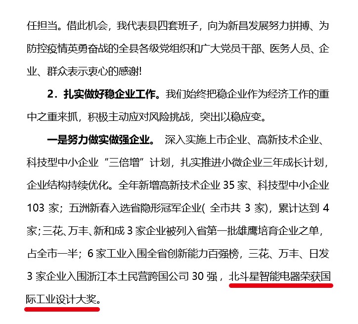 在大會上,新昌縣委書記李寧還點名表揚了北斗星智能電器榮獲國際工業設計大獎。
