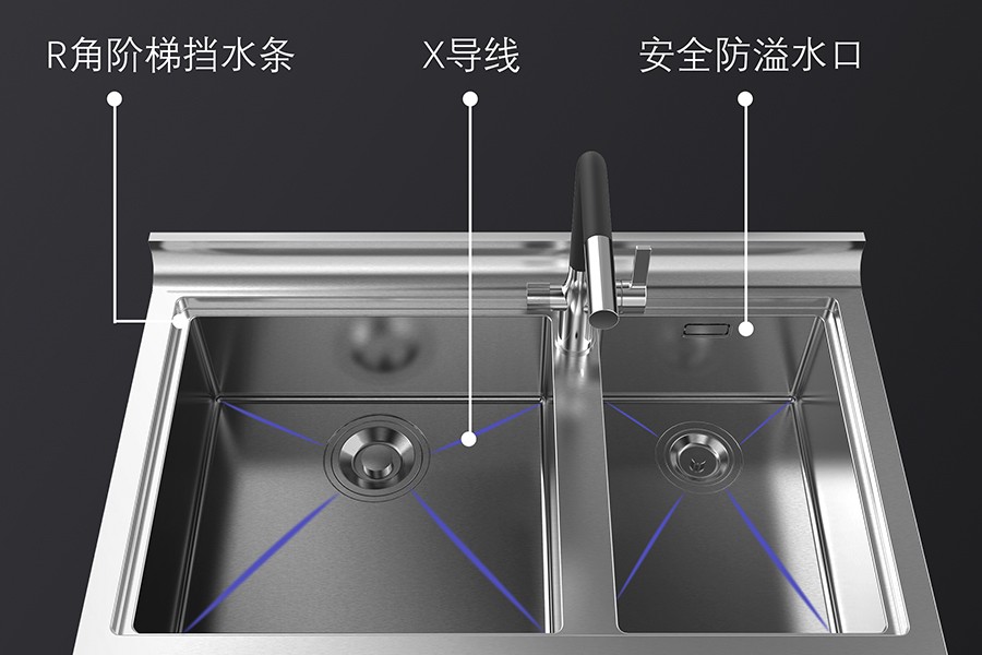 這個完全不用擔心!北斗星S3在細節處做了貼心設計。其中在水槽上邊設計有R角階梯擋水條,有效防濺水溢出,放心暢快洗。內部設計有安全防溢水口,有效防止溢水,再也不用擔心水漫金山。其底部X形導流線設計,下水高效自動牽引,更具包容性,避免水濺得到處都是。