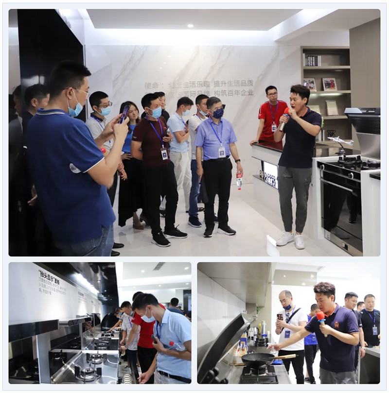 接著,參觀團到達北斗星公司展廳,工作人員為大家講解了“漂亮得不像實力派”機王A6,以及北斗星家族產品標志性的創新特性——“天一無縫,就是好擦”的一體式無縫臺面,擦洗無死角,就是好清理!現場爆炒辣椒演示,油煙一秒吸凈,近距離也不嗆,更為直觀地向大家展示北斗星集成灶的完美使用性能。