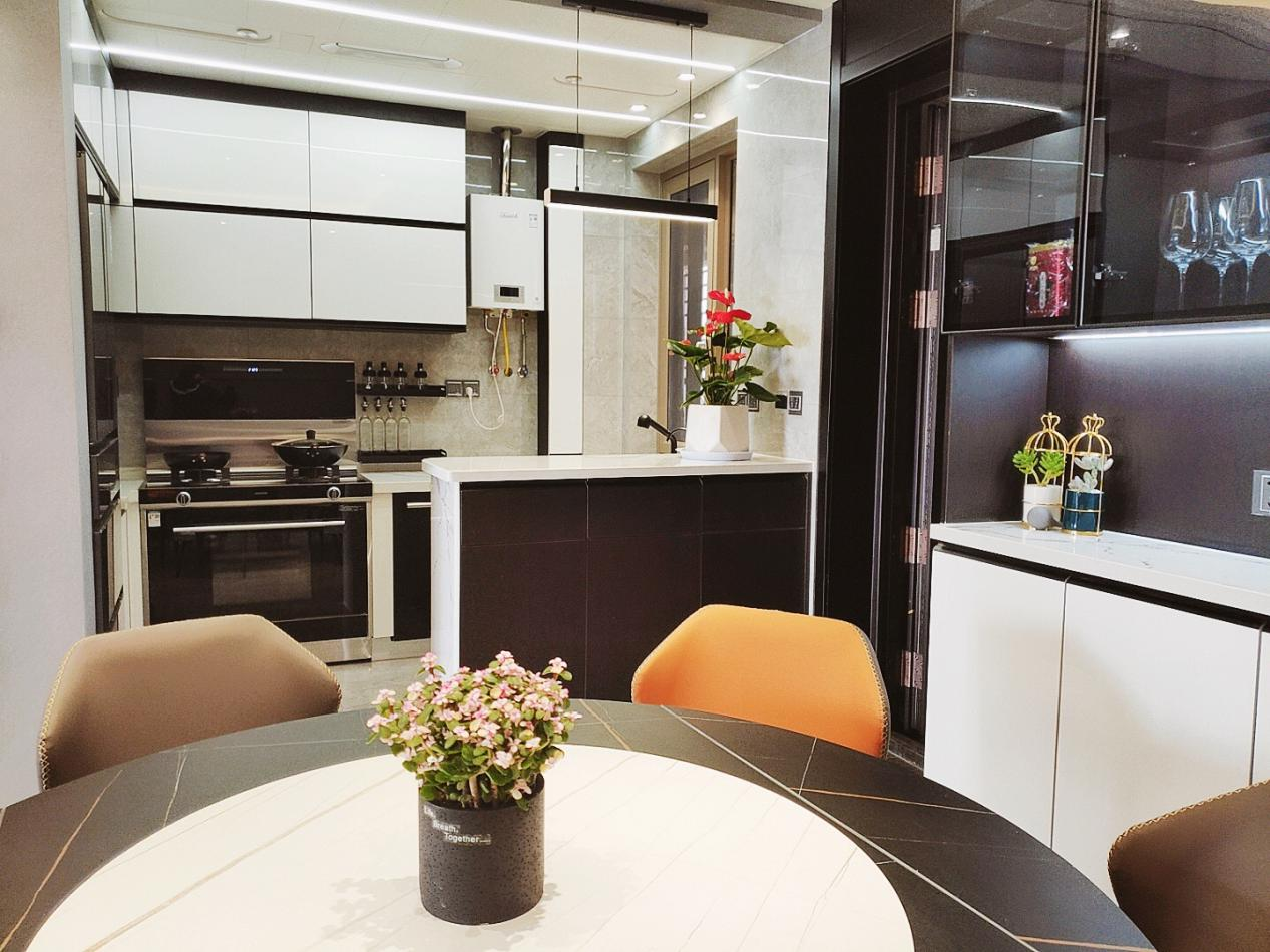 繁而不亂,這應該就是方女士的居家藝術吧,半開發式的廚房里,能清晰的觀賞愛人在灶臺前忙碌的身影,也是工作之余一道溫暖又獨特的風景。明亮寬敞的空間,干脆簡練的風格,完美詮釋了東方女人賢惠,得體之美。北斗星集成灶被安置在最顯眼的位置,也在暗暗顯現著女主的生活智慧,低調中暗含著高貴。