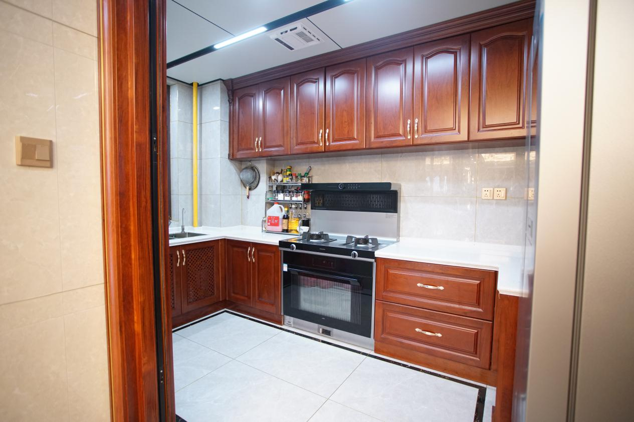 整個廚房的設計有別于傳統中式風繁復富麗、濃墨重彩的特點,而是以高雅配色和簡約線條設計,將經典與時尚結合,打造極具現代生活特色的極簡新中式廚房。柜區選用沉穩的“菩提棕”木紋配色,視覺上營造穩重之感,深淺層次分明,讓廚房顯得低調而有內涵。